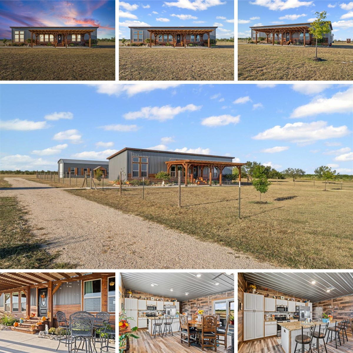 Imagine waking up to the peaceful sounds of nature, surrounded by breathtaking views, cattle, and rolling hills on this AG-exempt property. This stunning 2-bedroom, 2-bathroom home sits on over 5 acres of picturesque land with a half acre fenced in yard around the house, offering a serene retreat from the hustle and bustle of city life. The interior boasts an open-concept kitchen, dining, and living area perfect for entertaining. A large center island/breakfast bar, stainless steel appliances, abundant cabinetry, and recessed lighting complete the kitchen. The primary suite is a relaxing oasis, featuring a lovely front yard view and an en-suite bathroom with a soaking tub, separate tile shower, and dual vanities. With 1,188 square feet of living space, this home offers a perfect blend of rustic elegance and modern comfort. The property itself is a nature lover's paradise, with several trees, including Oaks, Cherry, Dogwood, and Magnolia, creating a stunning landscape. A 40' x 17' cedar pergola marks the front entrance, while the covered 12' x 24' back deck with outdoor lighting is perfect for unwinding and taking in the views. Additional features include a 20' x 30' RV cover behind the massive 20' x 60' x 16' detached garage. The property attracts abundant wildlife, and is minutes from the charming town of Lampasas, with its shops and restaurants. You'll also be within a short drive of Austin and Fort Hood. Designed for efficiency and durability, the home features dual-pane windows and is well-insulated, making it a comfortable retreat year-round. This charming mini barndo welcomes all creatures great and small - bring your horses, goats, chickens, and furry friends to enjoy the peace and quiet of the countryside. Surrounded by nature's beauty, abundant wildlife, and breathtaking starry skies, this haven offers the ultimate retreat.
