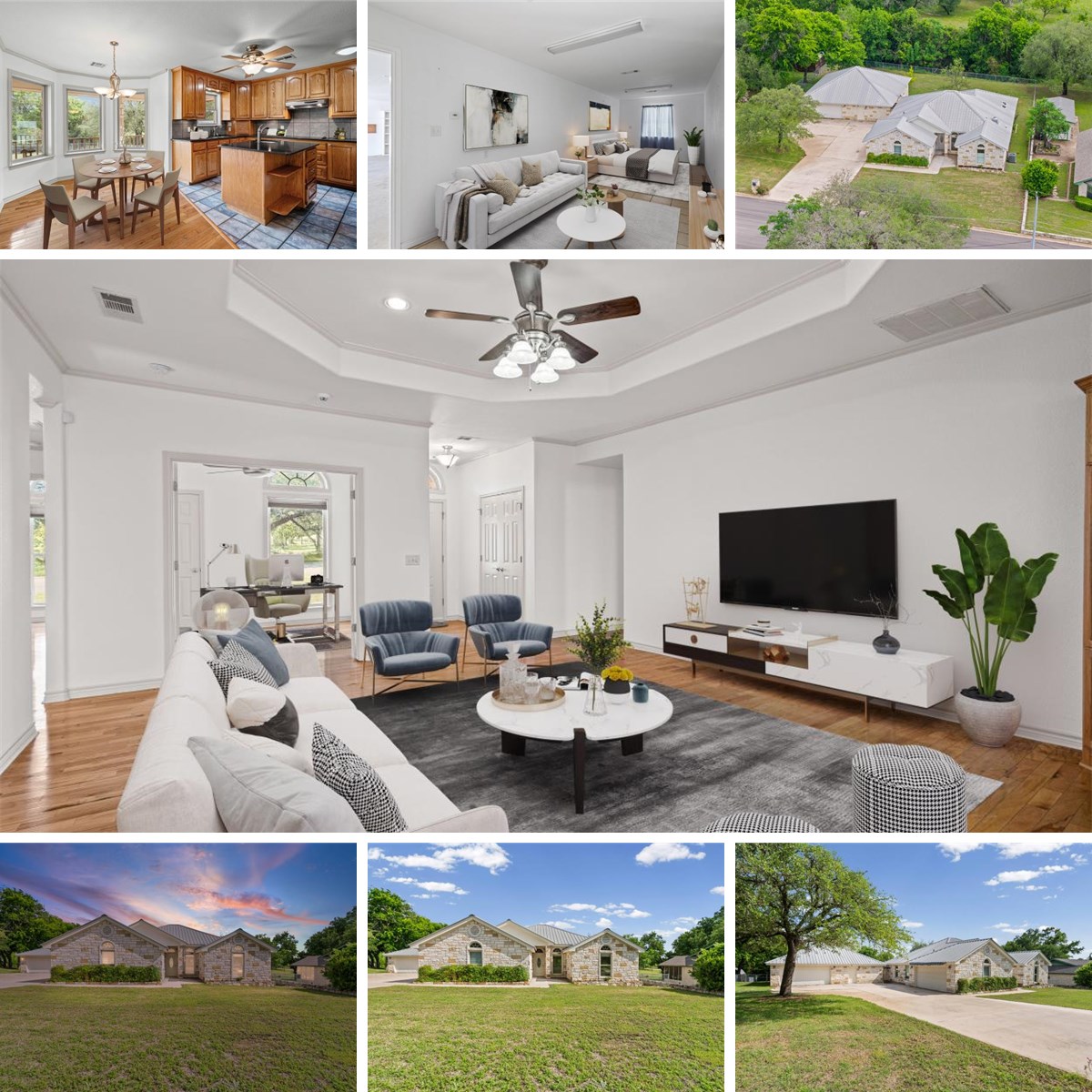 This Highland Acres home offers an amazing opportunity to own a home on over half an acre while remaining close to the local conveniences of downtown Burnet. This 3 bedroom, 3 bathroom home features a massive detached workshop and additional living quarters that are hard to find. Inside the main house, the floor plan is open and connected. As you walk through the front door, the warm hardwood flooring immediately draws you across the living room and into the kitchen and breakfast nook. The kitchen is equipped with stainless steel appliances and a central island with a built-in sink. Modern upgrades like HEPA HVAC filters, reverse osmosis water filtration, and a central vacuum system are included in this home. Just off the living room, a dedicated home office sits behind French doors, providing a quiet place to work without feeling disconnected from the rest of the household. The primary bedroom features a tray ceiling that adds a sense of volume to the space. The attached primary bathroom is a full ensuite with a soaking tub and separate shower, with two walk-in closets—one of which is a custom-built safe room framed with 1/4" steel and a steel door. Two additional bedrooms are situated to share a secondary bathroom. Beyond the interior, the home includes an attached two-car garage, but the standout feature is the detached workshop. This secondary building includes its own bathroom and finished living space, offering a flexible area for a gym or guest suite. Located in the Highland Acres area of Burnet, this property is surrounded by mature oak trees and a lush, green backyard that is maintained by an irrigation system fed by a private well. You are a short drive from the local dining and shops in downtown Burnet, with easy access to Highway 281 and Highway 29 for trips into Liberty Hill or Georgetown. The half acre lot ensures you have plenty of room to expand, park a boat for nearby Lake Buchanan, or simply enjoy the quiet landscape of the Texas Hill Country.